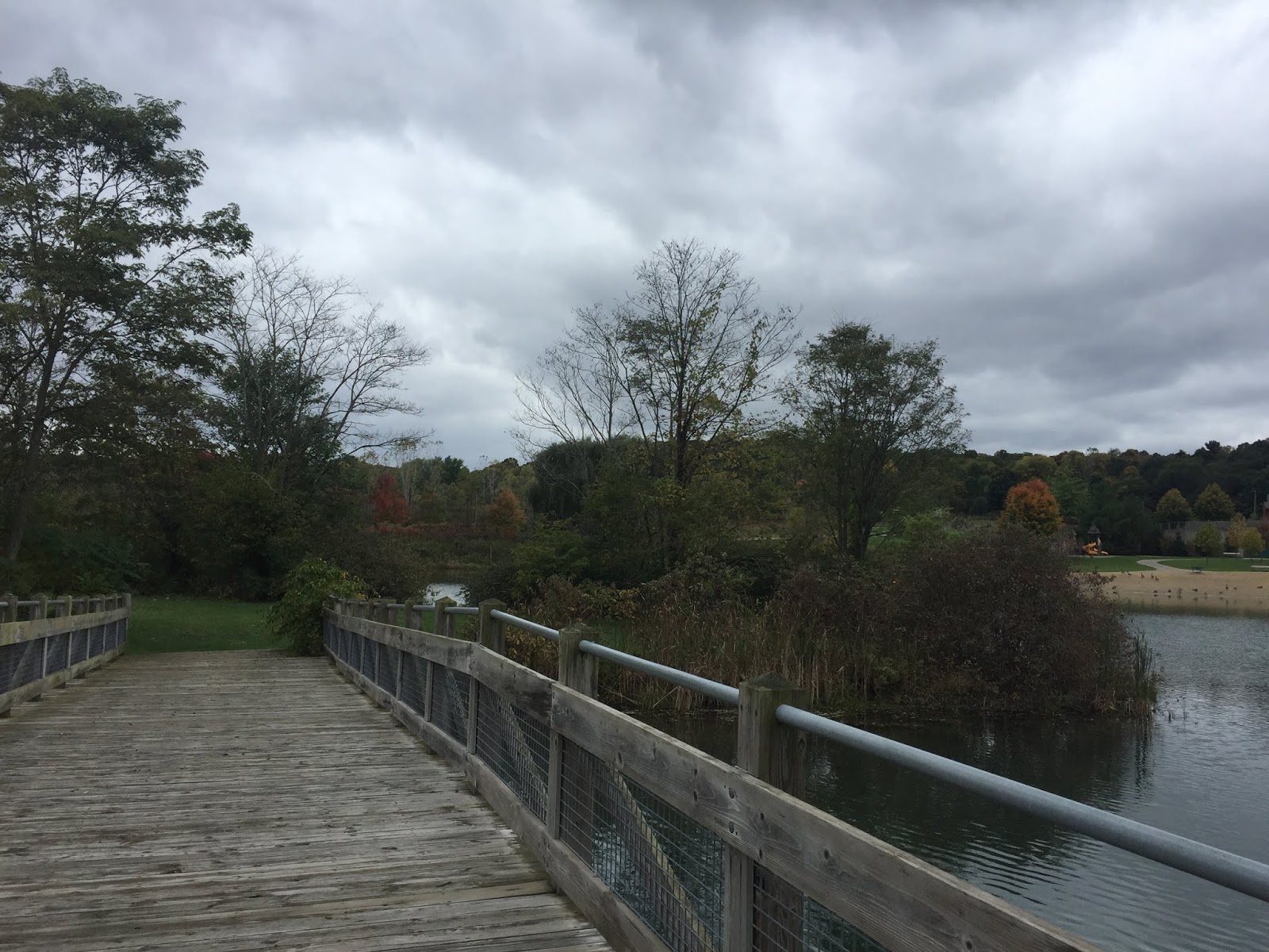 This park has a small swimming beach, which had been overtaken by ducks during our autumn visit. There are a couple of miles of paved trails in the park near the campsites, and mountain bike trails across the street. There are also picnic areas, two playgrounds, tennis courts, a fishing pond, and a small island with a footbridge out to it. No swimming or dogs are allowed on the island.