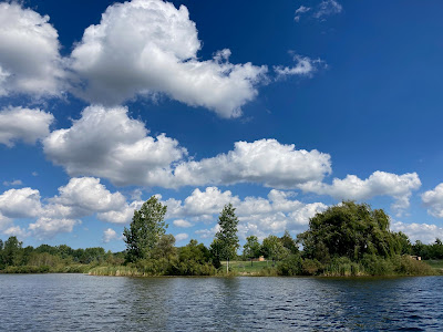 We took our inflatable dinghy out on the lake for the first time this year. During previous visits, we observed a few fishing boats on the lake, and the campground has kayaks and canoes for rent in the beach area. We put our boat in at the boat launch. The lake is quite shallow in many spots, and it seems like a kayak would be a better choice than a boat.